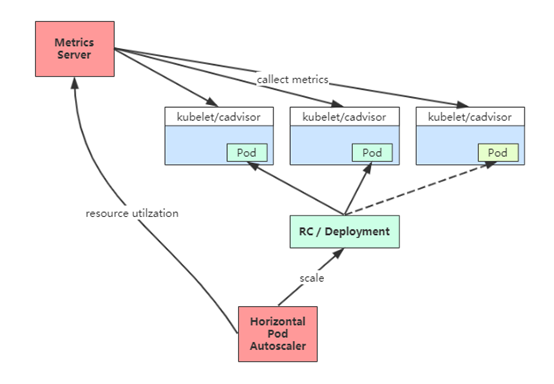 Kubernetes 中的 Metrics Server 持续采集所有 Pod 副本的指标数据。HPA 控制器通过 Metrics Server 的 API(Heapster 的 API 或聚合 API)获取这些数据,基于用户定义的扩缩容规则进行计算,得到目标 Pod 副本数量。当目标 Pod 副本数量与当前副本数量不同时,HPA 控制器就向 Pod 的副本控制器(Deployment、RC 或 ReplicaSet)发起 scale 操作,调整 Pod 的副本数量,完成扩缩容操作。如图所示。